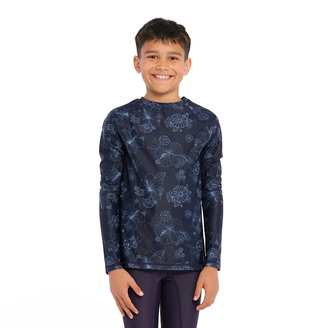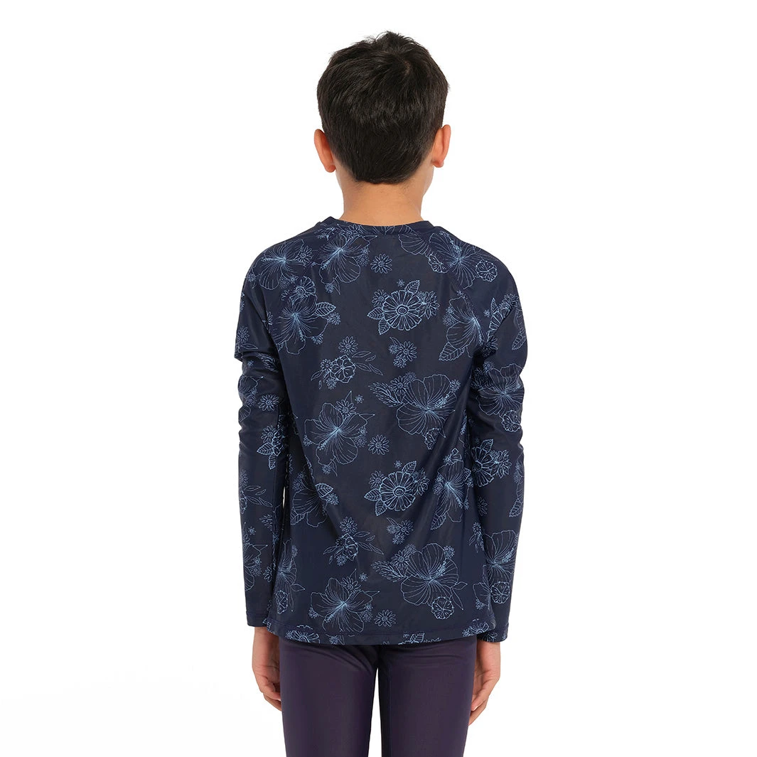 Our Kids Blue Bay Floral Long Sleeve Rashie is an ideal choice for beach and pool trips during the warmer months. Its long sleeve design features maximum UPF50+ protection, and its flexible fabric ensures comfort. When used together with our Swim Shorts or Board Shorts, this Rashie forms a stylish ensemble.